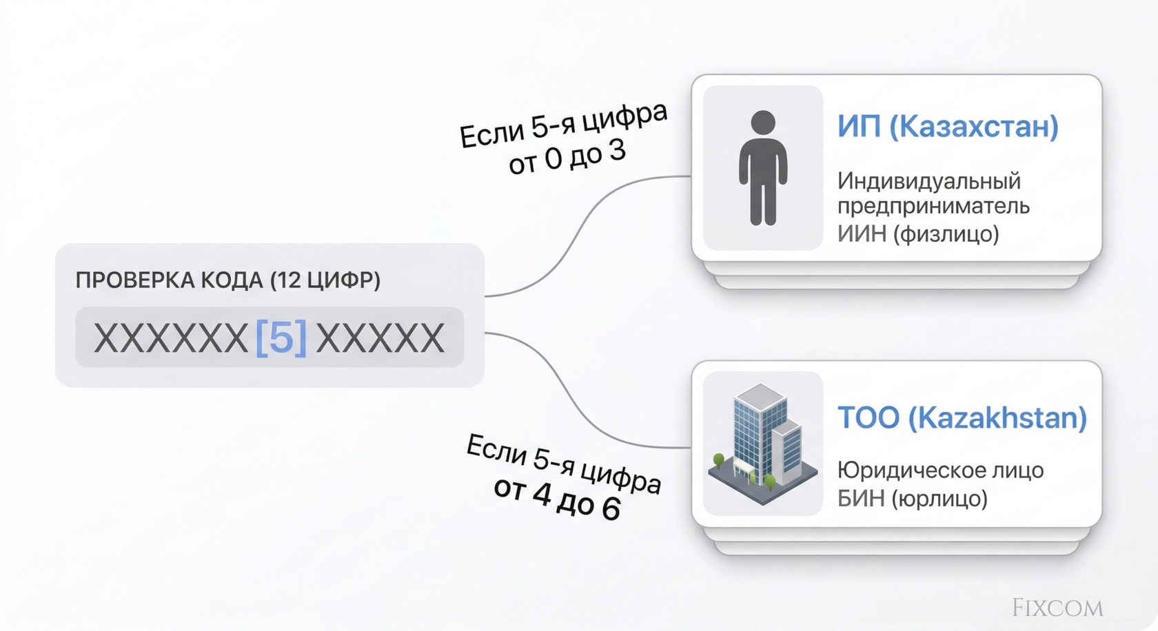 • Определение типа (ИП vs ТОО): Скрипт смотрит на 5-ю цифру кода: